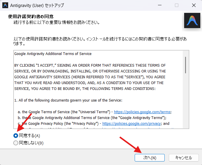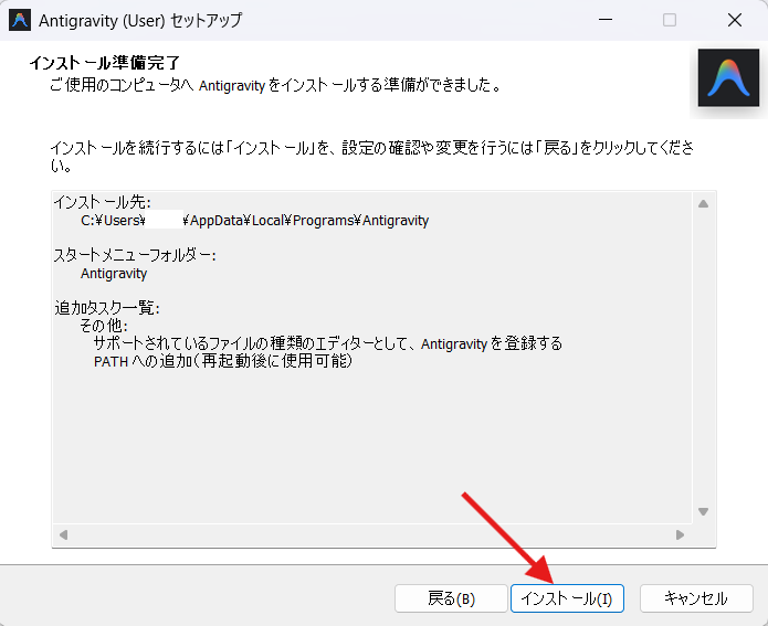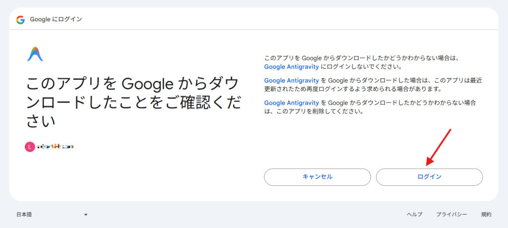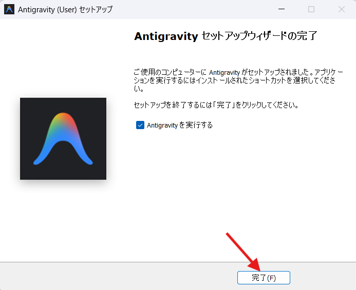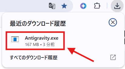ダウンロードしたファイル(Antigravity.exe )をダブルクリックして開きます。