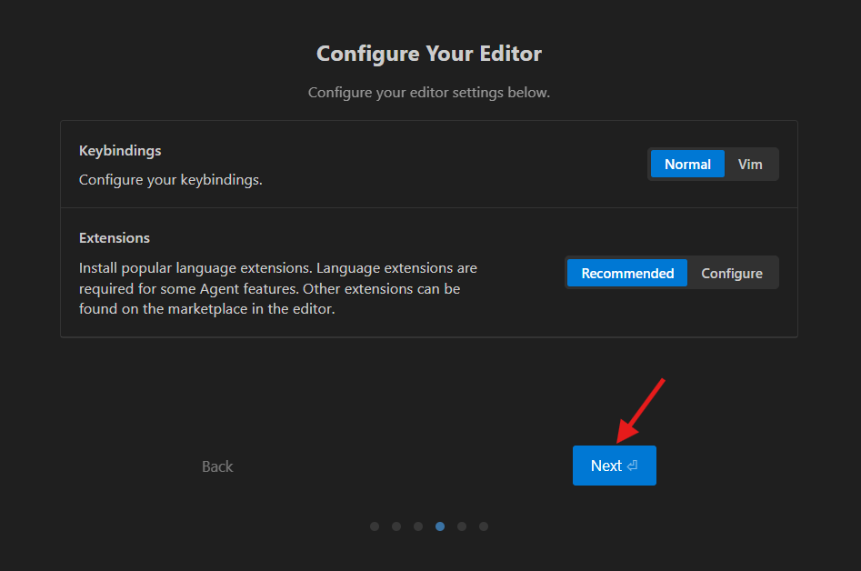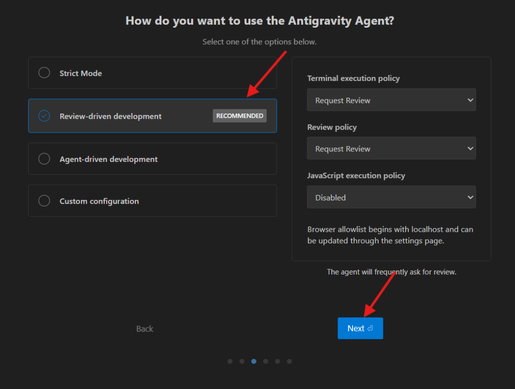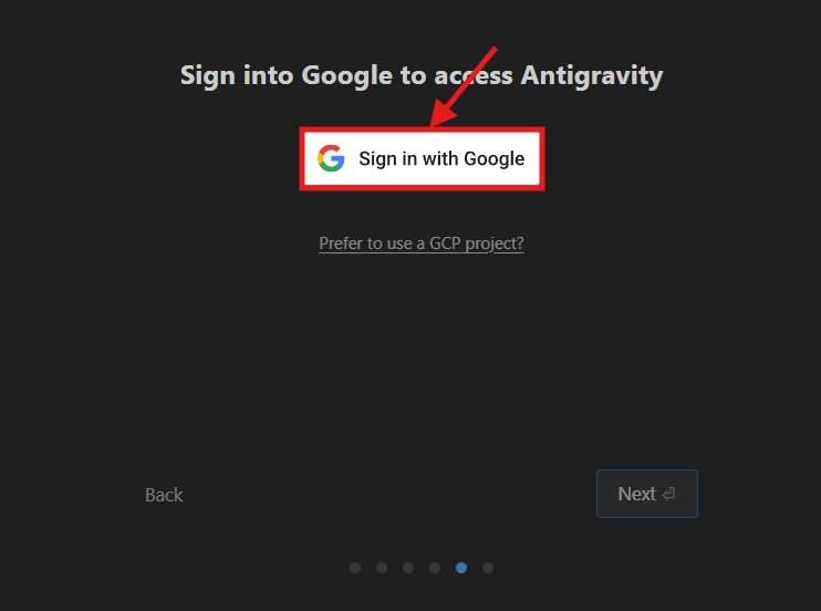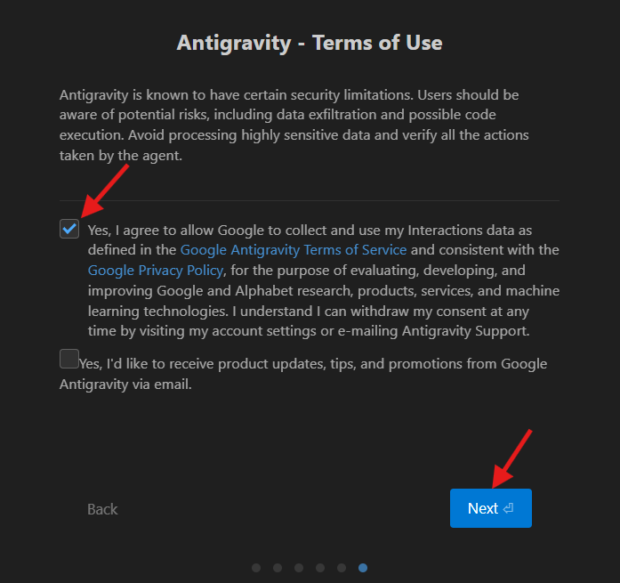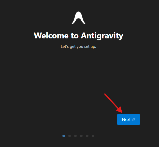インストールが終わってAntigravityを初めて起動すると、初期設定の画面が開きます。