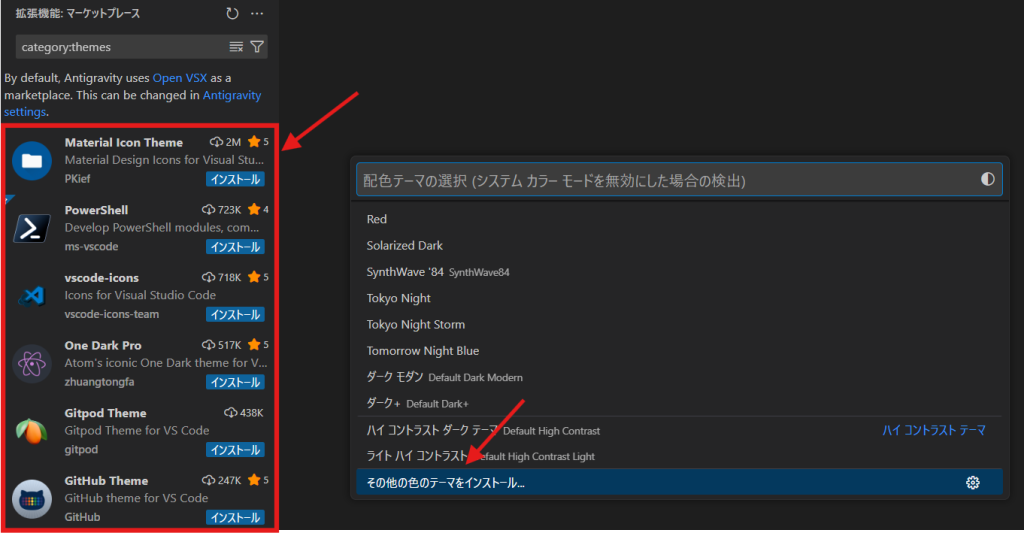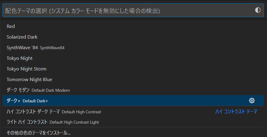 気に入った配色がない場合は「その他の色のテーマをインストール」をクリックするとその他のテーマをインストールできるのでお好みのテーマを探してみてください。