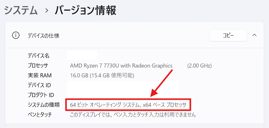 システムの種類は、「x64」と「ARM64」の2種類がある場合があります。