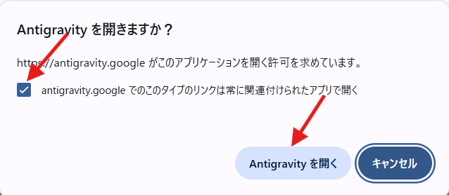 「antigravity.googleでのこのタイプのリンクには常に関連付けられたアプリで開く」にチェックを入れて「Antigravityを開く」をクリック。