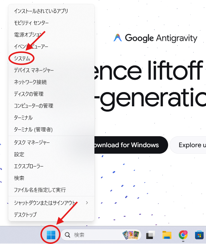 Windowsのアイコン上で右クリック→システム