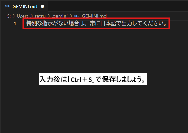 真ん中の枠に「GEMINI.md」というページが開かれるので「特別な指示がない場合は、常に日本語で出力してください。」と入力して「Ctrl+S」で保存。