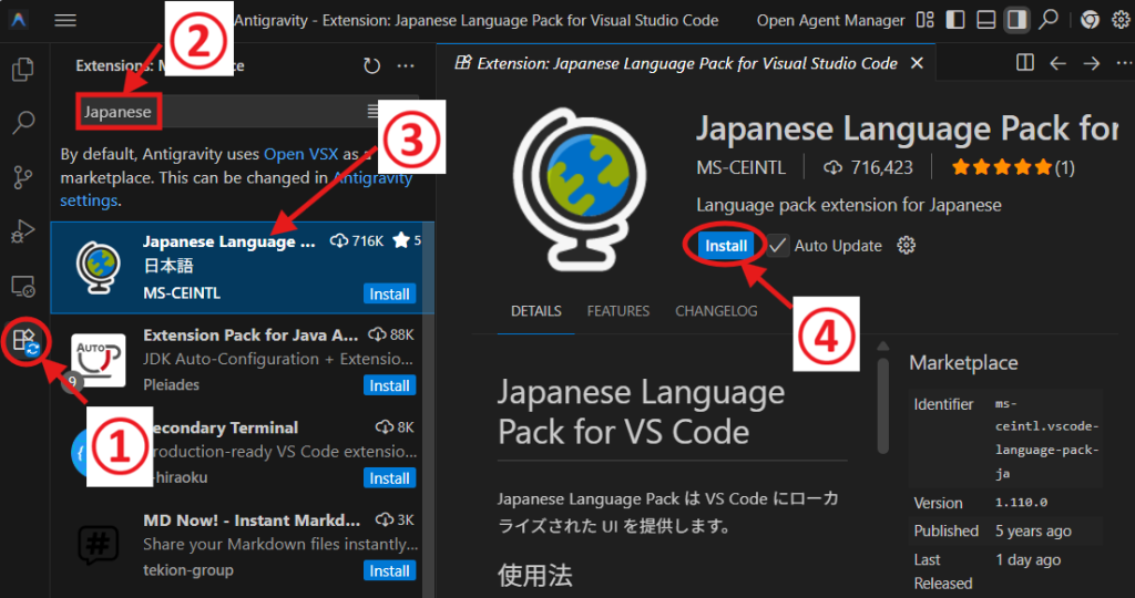 Japanese」と入力します。 - 地球儀のアイコンがついた「Japanese Language Pack for Visual Studio Code」というものが出てくるのでこれをクリック。