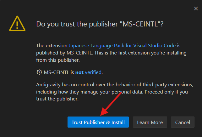 「この発行元を信頼しますか?」と問われているので「Trust Publisher & Install」をクリック