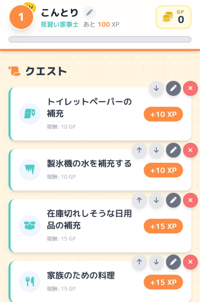 Step 2: クエスト(家事)をクリアして経験値&GPをゲット!