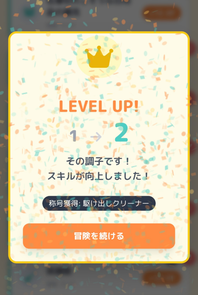 XPが一定まで貯まるとレベルアップ!「駆け出しクリーナー」や「家事マスター」といった素敵な称号が手に入ります。