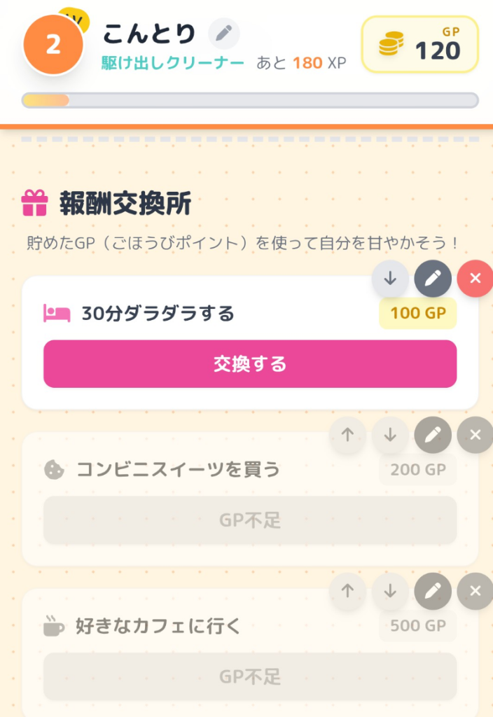 「30分ダラダラする(100GP)」「コンビニスイーツを買う(200GP)」など、頑張った自分をたっぷり甘やかしてあげてください。 GPが貯まったら「交換する」ボタンをタップ!素敵なご褒美タイムの始まりです♪