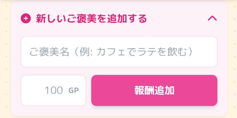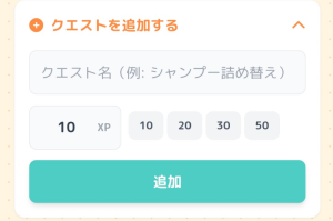 - 追加する: 各リストの下にある「クエストを追加する」「新しいご褒美を追加する」から、名前とポイントを入力して追加!