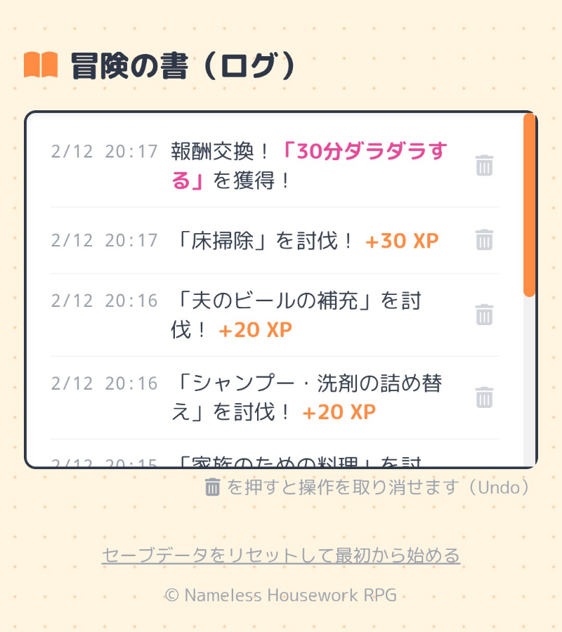 「今日だけでこんなに家事をやったんだ!」と振り返ることで、達成感を感じられるはず。 もし間違えてクエストをタップしてしまった場合は、ゴミ箱マーク🗑️を押せば「Undo(取り消し)」ができるので安心してくださいね。