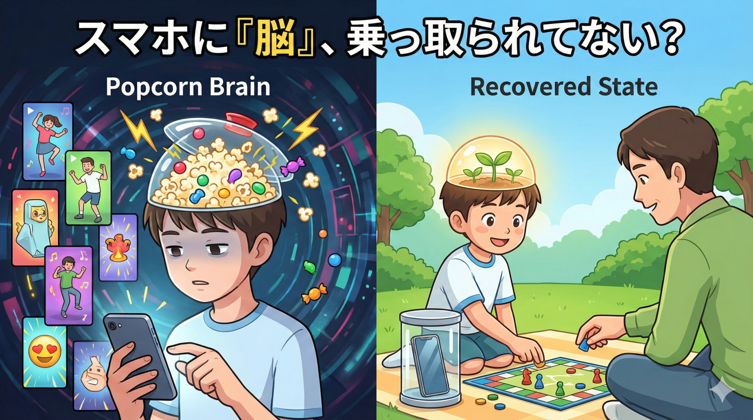 まだ発達段階にある子どもの脳にとって、これは「消化の良い流動食」のようなもの。噛んで味わう(深く考える)必要がないため、脳は楽を覚え、どんどん「噛む力(思考力)」を失っていきます。この「楽な刺激」への依存こそが、ポップコーン脳の入り口なのです。